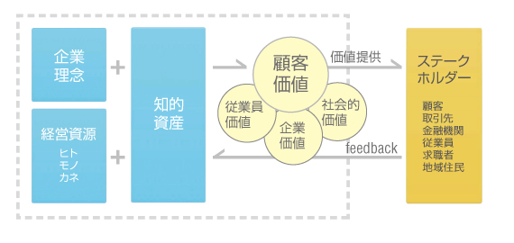 企業はその基本的価値観である企業理念のもと、経営資源(ヒトモノカネの資源+知的資産)を活用して価値を生み出し提供します。その価値がステークホルダー(企業を取り巻く関係者)に認められてfeedbackを得てまた事業を継続することができるのです。